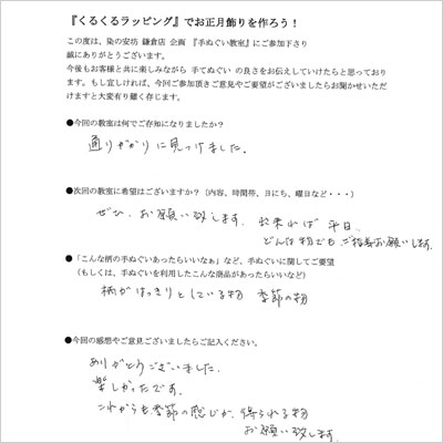 昨年末に手ぬぐい教室「くるくるラッピングでお正月飾りを作ろう!」を開催いたしました。